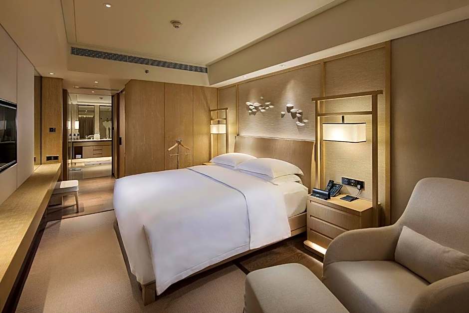 Spacious and modern 45 sq.yard King Accessible Guest Room with the floor-to-ceiling windows showcasing Shenzhen Bay views, which offers a specially designed furniture configuration and one king-sized Serenity bed. Refresh in the elegant bathroom with easy roll-in shower, safety bars and a lowered toilet, watch a movie on the 46-inch HDTV, or stay connected with wireless and wired internet access. The accessible guest rooms benefit from a visual alarm system.